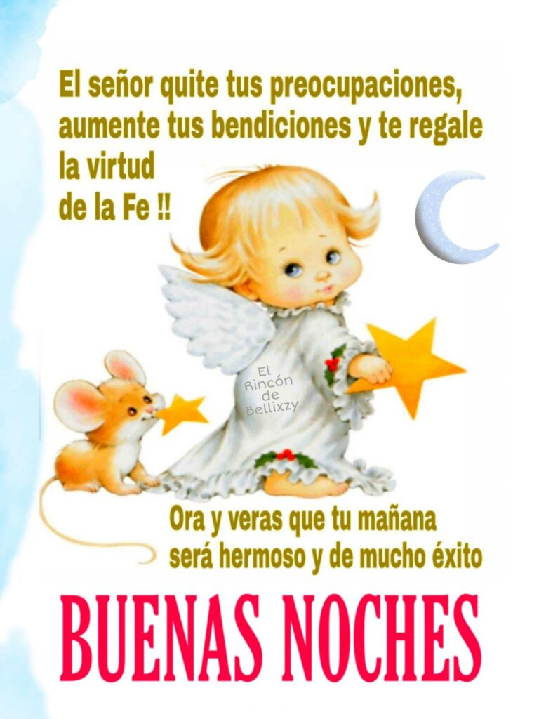 Buenas Noches, Sueña Bonito – El Rincón de BellixzyLes deseo una hermosa noche…Dios llenará tu vida de grandes bendiciones, solo resiste y mantén la fe. ¡Buenas Noches! – Amor y cenizasFeliz Noche, DIOS TE BENDIGA (Mundo de corazones) Dios no es un Dios de improvisaciones, es un Dios de Planes Peopósitos y Bendiciones.Hasta Mañana amig@s, Sean FelicesEsto es lo lindo de la noche… !!! Dormir en tranquilidad y con la esperanza que mañana será otro día mejor… Que descanses.Hora de descansar… Linda Noche !!!Buenas Noches! Mañana ya es Lunes. Nooooo…..Buenas Noches. Que la paz de Dios te cubra a tí y a toda tu familia. – El jardin de Fela FlorGracias Dios porque aunque desconozco lo que esta por delante, me siento segur@ de que mi futuro está en tus manos Señor.Les deseo una hermosa noche y que tengan lindos sueñosNunca te sientas sola, recuerda que Dios siempre está a tu lado. ¡Buenas noches!El Señor quite tus preocupaciones, aumente tus bendiciones y te regale la virtud de la Fe !!! Ora y veras que tu mañana será hermoso y de mucho éxito. BUENAS NOCHESCon tu compañia sé que todo está bien… Nuestras almas se cominicas aún en el silencio… ¡¡Buenas Noches!!Es hora de aparcar la realidad y volar hacia los sueños… Feliz Descanso!BUENAS NOCHES DULCES SUEÑOSCuando apagues la luz recuerda dar gracias a Dios por las bendiciones recibidas y las que vendrán. Buenas NochesBuenas Noches, Dulces Sueños, BendicionesA dormir… Buenas NochesDescansa, porque Dios te bendecirá y no habrá nada que pueda impedirlo. ¡Buenas Noches!BUENAS NOCHESBuenas Noches Dulces SueñosGracias Señor por darnos esta noche. Nos ponemos en tus manos ahora que vamos a descansar. Gracias por bendecirnos y ayudarnos…Qué ésta noche pueda reposar con tranquilidad, meditando en tus promesas de paz y amor. Buenas Noches !BUENAS NOCHES, QUE ESTÁ NOCHE DIOS LOS ABRACE CON SU DULCE Y MAGNÍFIVO AMOR, LOS PROTEJA DE TODO MAL Y BENDIGA SU DESPERTAR.Señor, me voy a dormir con la tranquilidad de saber que cuidas de mi y de mis seres queridos… Gracias por esta semana que termina…Mañana más y mejor… Lindos sueños !!!Dios cuide tu descanso, Buenas NochesPadre Nuestro, acompañamos en nuestro descanso esta noche y permite que veamos la luz de un nuevo amanecer. Buenas nochesGracias Dios por la noche de descanso, danos un sueño profundo bajo tu cuidado y amor. Buenas Noches !! – Salvemos AL AMOR MGBuenas Noches. Bajo tu cuidado nos vamos a descansar, tú eres bueno Señor, llena de ti nuestros sueños.