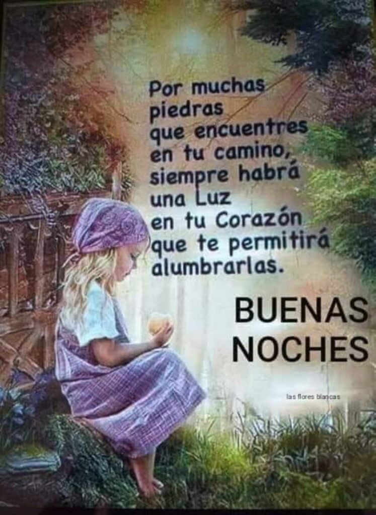 Buenas noches. Qué bonito trabajo el de la Luna ilumina vidas cuando andan a oscuras. (Las flores blancas)Por muchas piedras que encuentres en tu camino, siempre habrá una Luz en tu corazón que te permitirá alumbrarlas. BUENAS NOCHESBUENAS NOCHES, BUEN DESCANSO. Que Dios alivie tu cansancio, renueve tus fuerzas y cuide de cada una de tus preocupaciones… (SRA. SARCASMO)Dulces Sueños! Los sueños dan sentido a la vida. Cuando tienes uno, lo buscas, luchas, perseveras, te arriesgas, lo alcanzas y eres feliz… Vale la pena soñar! (Sigo tu camino)Respiro, agradezco, descanso y duermo porque sé que Dios está a mi lado. (Amor y nostalgia)Imágenes muy bellas para Buenas nochesDeja tus preocupaciones fuera de la cama, la noche te espera con un plácido descanso.Haznos fuertes Señor con tu fuerza…Y colorin colorado este día se ha terminado! Que Dios los bendiga amigos. Buenas Noches (Tu lugarcito en el mundo)BUENAS NOCHES. Que tengas una dulce noche, tranquila y llena de paz.Este día fue pesado… creo que mensajeamos mañana, ok, Buenas Noches (Diddl)Feliz Noche. Y cuando llega la noche antes de descansar hay que darle gracias a Dios por otro día que termina y la noche que llega.Ya me voy a dormir pero antes les deseo una… Linda Noche, hasta mañana amigos… (Mi mundo es tu sueño)Gracias Dios por haberme acompañado este día, sé que nunca me abandonas. Buenas NochesHora de soñar (Ditano)Buenas Noches, Descansa…!!! – imágenes tiernas¡FELIZ NOCHE! – Imágenes de veranoBuenas Noches!feliz noche imágenes para WhatsApp, Facebook y TelegramBuenas noches, desde mi mundo mil bendicionesFelices sueños…¡Buenas Noches! Que tengas una linda noche y un hermoso despertar, Dios bendiga tu descanso!Buenas NochesYa me voy a la camita… Quién me la las ¿Buenas Noches? Hasta mañanaBuenas noches corazones, DIOS TE BENDIGANo sé que me espera mañana, pero estoy en paz pues sé que Dios tiene lo mejor para mi. Hasta mañanaQue tengan una noche en calma y un bello despertar…Buenas NochesHoy comienza a creer que todo lo que Dios te ha prometido se cumplirá. ¡Buenas Noches!Buenas noches corazones, hasta mañana si Dios quiere.Frases nuevas para decir Buenas Noches en WhatsappBUENAS NOCHES. Dulce Madre no te alejes tu vista de mi no apartes. Ven conmigo a todas partes y nunca solo me dejas…Buenas noches, feliz descanso. Señor: Que bueno es saber que no estás lejos de mi, cuando te busco te encuentro, Gracias por estar siempre a mi lado.Bendito sea Dios que nos cuidó y protegió durante este día.Finalizado es Día!!! HASTA MAÑANABuenas Noches!! Nos vemos en tus sueños !!Buenas Noches! Oh Señor de los ejércitos, icuán bienaventurado es el hombre que en ti confía! (Salmos 84:12)