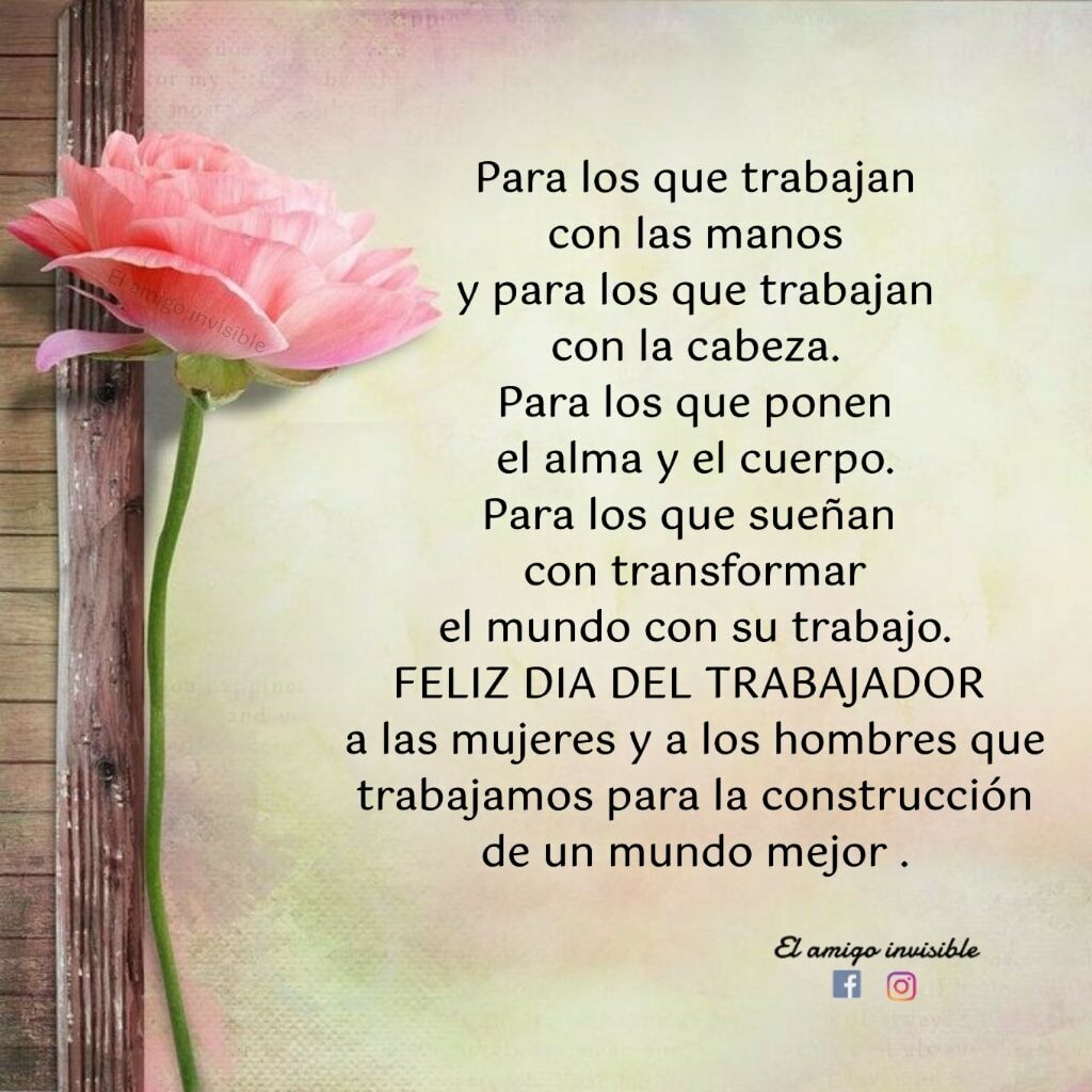 Feliz Día del Trabajador, todo trabajo cuenta.. !! 1 de MayoPara los que trabajan con las manos y para los que trabajan con la cabeza. Para los que ponen el alma y el cuerpo, Para los que sueñan con transformar en mundo con su trabajo. FELIZ DÍA DEL TRABAJADOR a las mujeres y a los hombres que trabajamos para la contrucción de un mundo mejor. (El amigo invisible)FELIZ DIA DEL TRABAJO. Gracias a Dios a todos los que cuentan con un trabajo que Dios los siga bendiciendo. Pero si quiero felicitar a todas las amas de casa que son las ¡más trabajadoras!